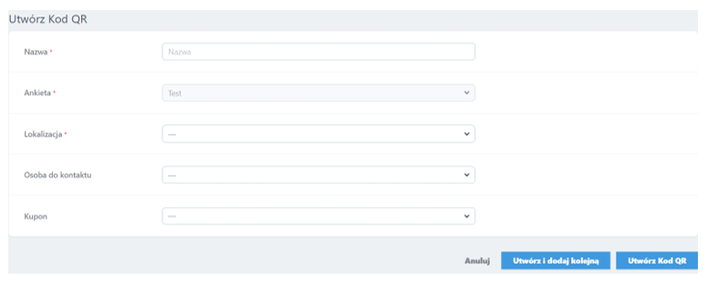 To panel służący do zarządzania i tworzenia kodów QR. Aby utworzyć kod należy nadać mu nazwę, powiązać z utworzoną ankietą i lokalizacją. Dodatkowo można „powiązać” kod QR z osobą i dodać do niego kupon.