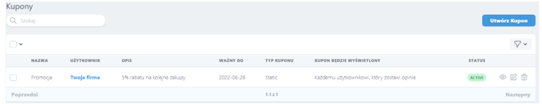 Panel Kupon służy do zarządzania, edytowania i tworzenia nowych kuponów. Kupon stanowi dodatek do kodu QR i ankiety, może zawierać np. ofertę promocyjną w postaci kodu zniżkowego lub inną ofertę.